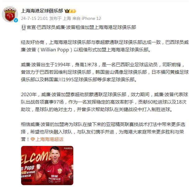 7月15日晚,上海海港足球俱乐部发布官方公告,宣布巴西球员威廉·波普租借加盟。