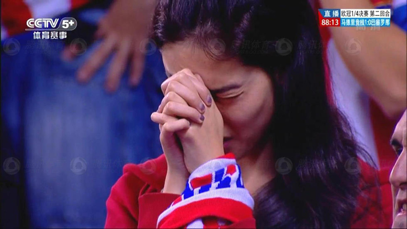 在比赛进入到下半场第64分钟时,央视转播镜头中出现了一位美女球迷,时长5秒钟。第88分钟,这位美女球迷再次出现在镜头中,这一次央视镜头停滞了4秒才又回到比赛画面中。在这4秒钟里,她低着头,似乎场上的紧张局面让她不敢再抬头观看比赛。