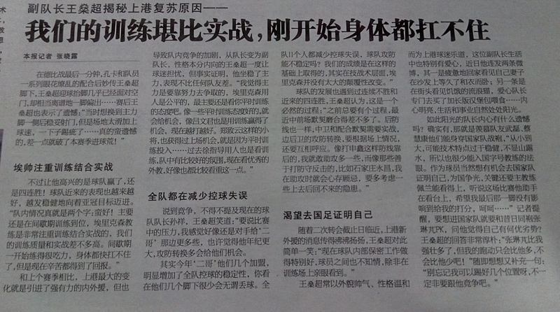 副队长王燊超在谈及上港复苏的原因时表示,球队平时训练堪比实战,刚开始的时候身体都扛不住。
