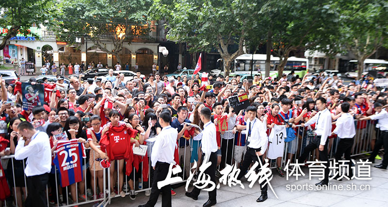 上海热线体育频道讯:今天下午,拜仁全队抵达上海,在下榻的酒店门口也早已围满了大批拜仁粉丝,他们高举球衣和海报等到众星的抵达。当拜仁抵达时,现场爆发出山呼海啸的般的呼喊声,女粉丝更是尖叫不断。