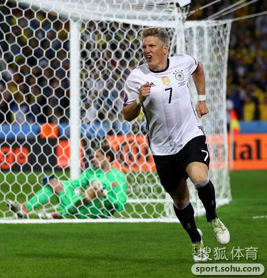 北京时间6月13日凌晨3时,2016年欧洲杯C组首个比赛日的一场重头戏,在里尔的皮埃尔-莫鲁瓦球场,世界冠军德国队2-0轻取东欧劲旅、上届欧洲杯东道主之一乌克兰。第19分钟,克罗斯任意球传门前,中卫穆斯塔菲门前头球冲顶破门。第92分钟,厄齐尔反击中左路传中,替补登场的施魏因斯泰格锁定胜局。图为小猪奔跑庆祝。