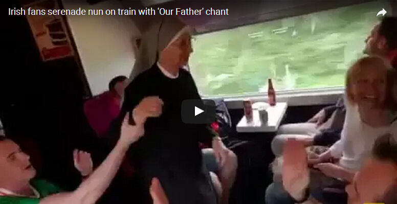 都说爱尔兰人天生会唱歌,2016年欧洲杯在一辆赶回比赛场地的火车上,有几位爱尔兰球迷刚好见到一位修女走过,马上集体一边拍手一边随口合唱起了圣歌,弄得修女一脸尴尬。