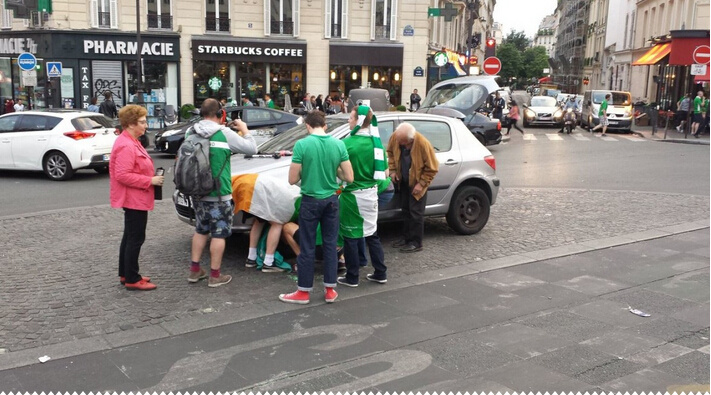 爱尔兰球迷可以说本届欧洲杯的一股清泉,球场外不断传递正能量,有几位爱尔兰球迷见到一位老爷爷的汽车爆胎了,自告奋勇在路边帮忙换胎,当时这位换胎的老哥身上还披着爱尔兰国旗,他就不怕弄脏吗?